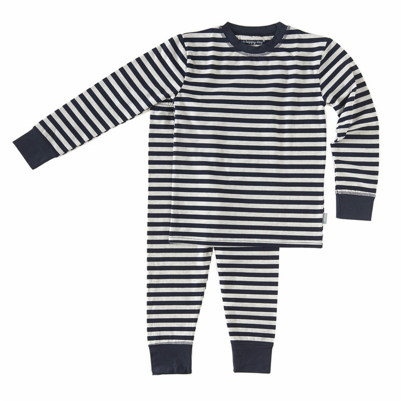 Cooler Ringelpyjama. Dunkelblau mit hellgrau. Bündchen am Ärmel, Halsausschnitt und Beinabschluss in Kontrastfarbe. Little Label entwirft traumhafte Nachtwäsche.