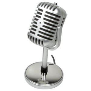 Retro-Style Desktop-Mikrofon mit hohe Leistung und auf Stativ. Benutzerfreundliche Steuerung und Mute-Taste.