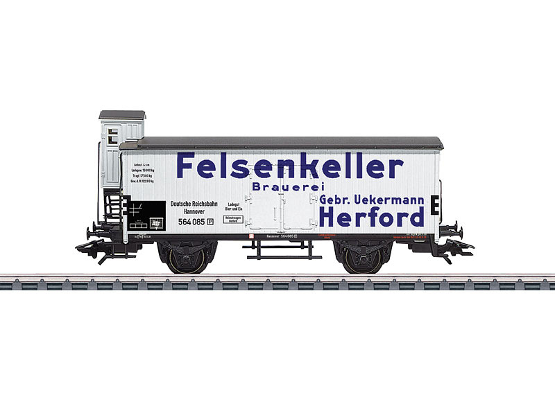 Vorbild: Zweiachsiger Bier-Kühlwagen mit Bremserhaus württembergischer Bauart. Privatwagen der Felsenkeller Brauerei Gebr. Uekermann, Herford. Eingestellt bei der Deutschen Reichsbahn (DRG).