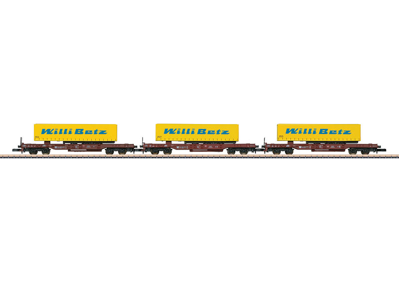 Modell: Fahrwerk der Taschenwagen jeweils aus Metall. Alle Wagen jeweils beladen mit einem Sattelauflieger der Spedition "Willi Betz". Feine Farbgebung und Beschriftung. Alle Wagen und Sattelauflieger mit unterschiedlichen Betriebsnummern. Eingebaute Kurzkupplungshaken. Gesamtlänge über Puffer 234 mm.