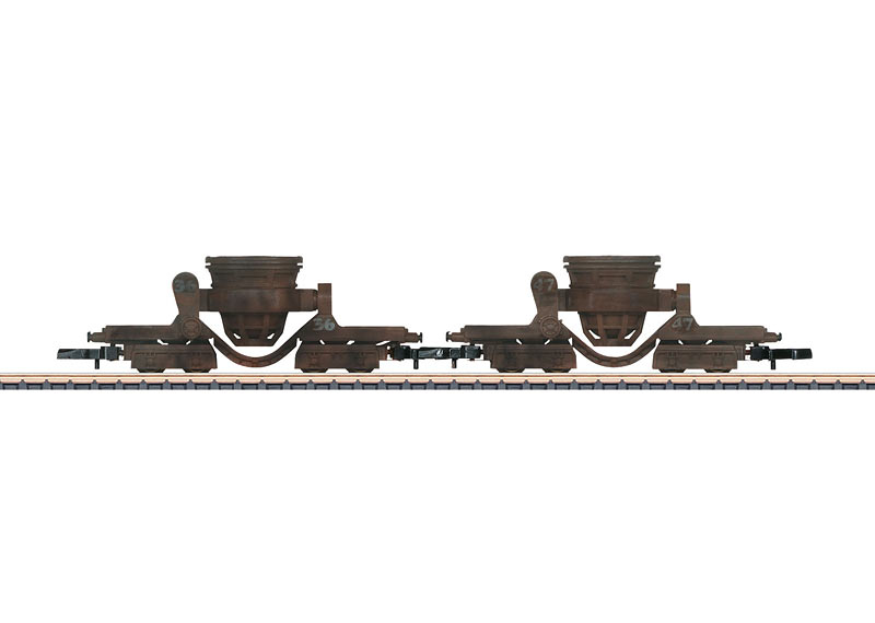 Modell: 2 Wagen mit unterschiedlichen Betriebsnummern und realistischen Alterungsspuren. Spezialdrehgestelle in kurzer Bauart. Bewegliche Lademulden. Gesamtlänge über Puffer 95 mm.