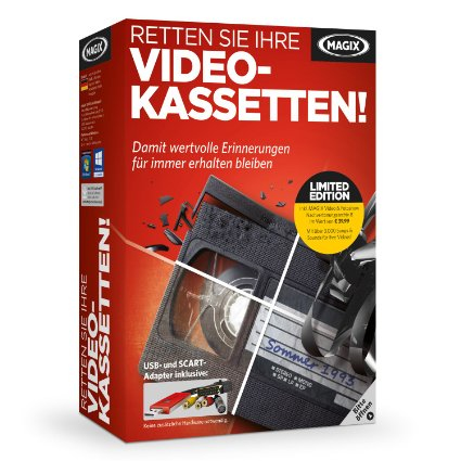 Retten Sie Ihre Videokassetten! Limited Edition Mit der Limited Edition des MAGIX Video-Rettungspakets sichern Sie Ihre geliebten Aufnahmen von alten VHSKassetten auf dem eigenen Computer oder auf DVD und Blu-ray Disc - ohne jegliche Vorkenntnisse, in nur wenigen Schritten! Verbinden Sie Ihr Videogerät einfach mit dem im Lieferumfang enthaltenen USB-Videowandler und starten Sie mit dem Digitalisieren.Das Rettungspaket eignet sich übrigens nicht nur für VHS-Aufnahmen, sondern auch für Video 8, S-VHS, Hi8 und jedes andere Bandformat.