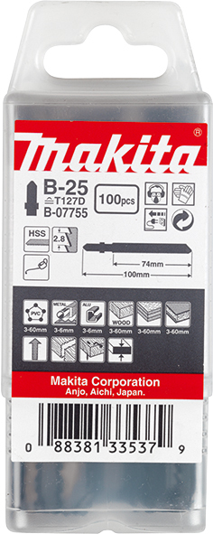 Makita B-07755. Produkttyp: Jigsaw blade, Für Materialien geeignet: Aluminium, Metall, Holz, Material Messer: Hochgeschwindigkeitsstahl (HSS). Arbeitslänge: 7,4 cm, Sägeblatt Abstand: 2,8 mm. Menge pro Packung: 100 Stück(e)