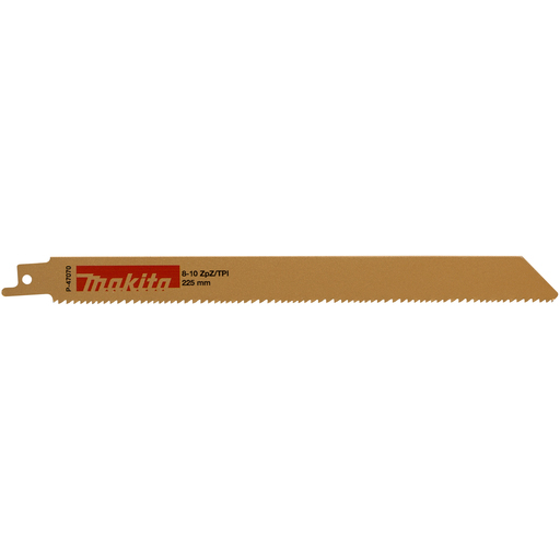 Makita P-47070. Produkttyp: Sabre saw blade, Für Materialien geeignet: Edelstahl, Holz, Material Messer: Bimetallisch. Arbeitslänge: 20,5 cm, Anzahl der Zähne pro Zoll: 8 - 10, Klingenzahnabstand (min.): 2,5 mm. Gesamtlänge: 22,5 cm. Menge pro Packung: 5 Stück(e)