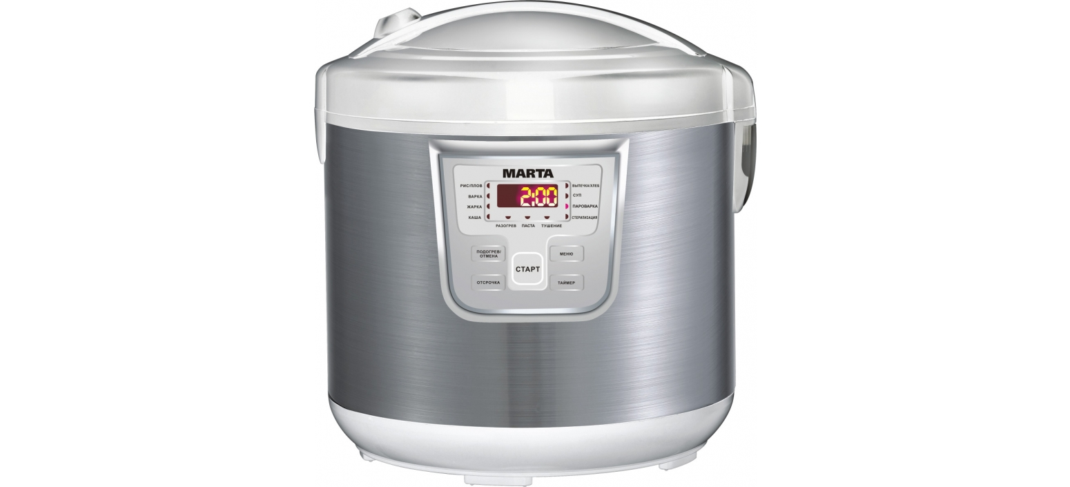 MARTA MT-1971. Fassungsvermögen: 5 l, Leistung: 860 W, Kochprogramme: Backen, Boil, Suppe, Dampf. Produktfarbe: Edelstahl, Weiß, Gehäusematerial: Edelstahl, Schüsselmaterial: Keramik. AC Eingangsspannung: 220-240 V, AC Eingangsfrequenz: 50 Hz. Breite: 285 mm, Tiefe: 285 mm, Höhe: 305 mm