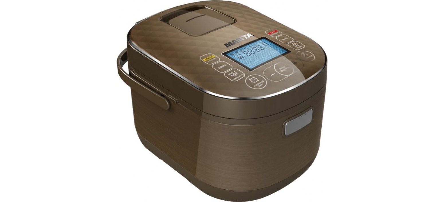 MARTA MT-1979. Fassungsvermögen: 5 l, Leistung: 860 W, Kochprogramme: Backen, Boil, Chef, konventionell, Fisch, Braten, Fleisch, Milk, Omelet, Brei, Neuerwärmen, Suppe, D. Produktfarbe: Gold, Gehäusematerial: Edelstahl, Schüsselmaterial: Keramik. AC Eingangsspannung: 220-240 V, AC Eingangsfrequenz: 50 Hz. Gewicht: 4,85 kg. Verpackungsbreite: 42,5 cm, Verpackungstiefe: 33,5 cm, Verpackungshöhe: 30,5 cm