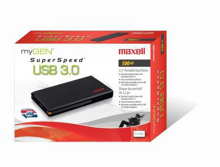 Maxell 500GB MyGEN. USB-Version: 3.0 (3.1 Gen 1), USB-Stecker: USB Type-A. Produktfarbe: Schwarz. Kompatible Betriebssysteme: Windows 2000+, Mac OS X+
