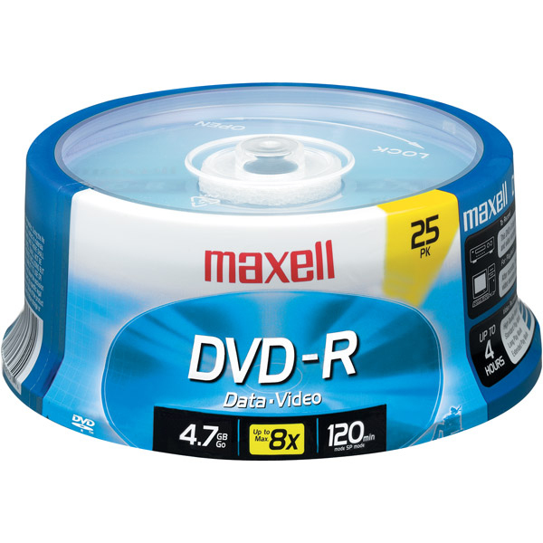 Maxell DVD-R. Kapazität ohne Komprimierung: 4,7 GB, Typ: DVD-R, Menge pro Packung: 25 Stück(e). Verpackungsart: Spindel