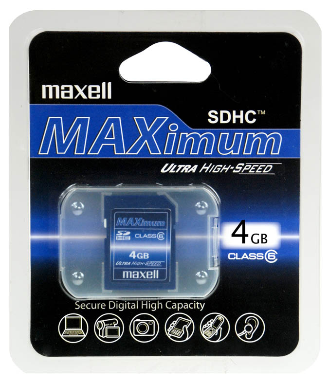 Maxell MAXimum SDHC. Kapazität: 4 GB, Flash Card Typ: SDHC. Produktfarbe: Schwarz. Verpackungsart: Sichtverpackung. Formfaktor: SDHC