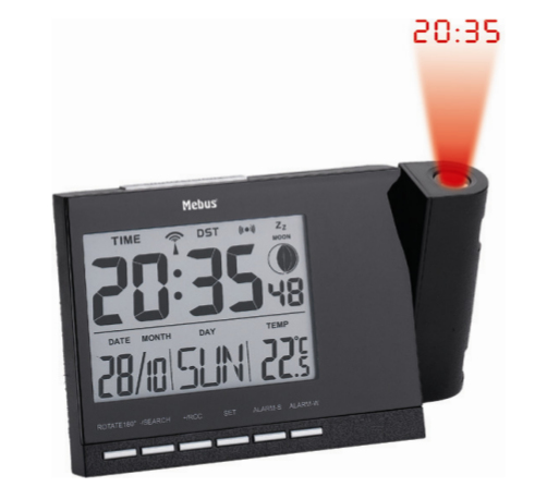 - projiziert Uhrzeit und Innentemperatur abwechselnd an Wand oder Decke