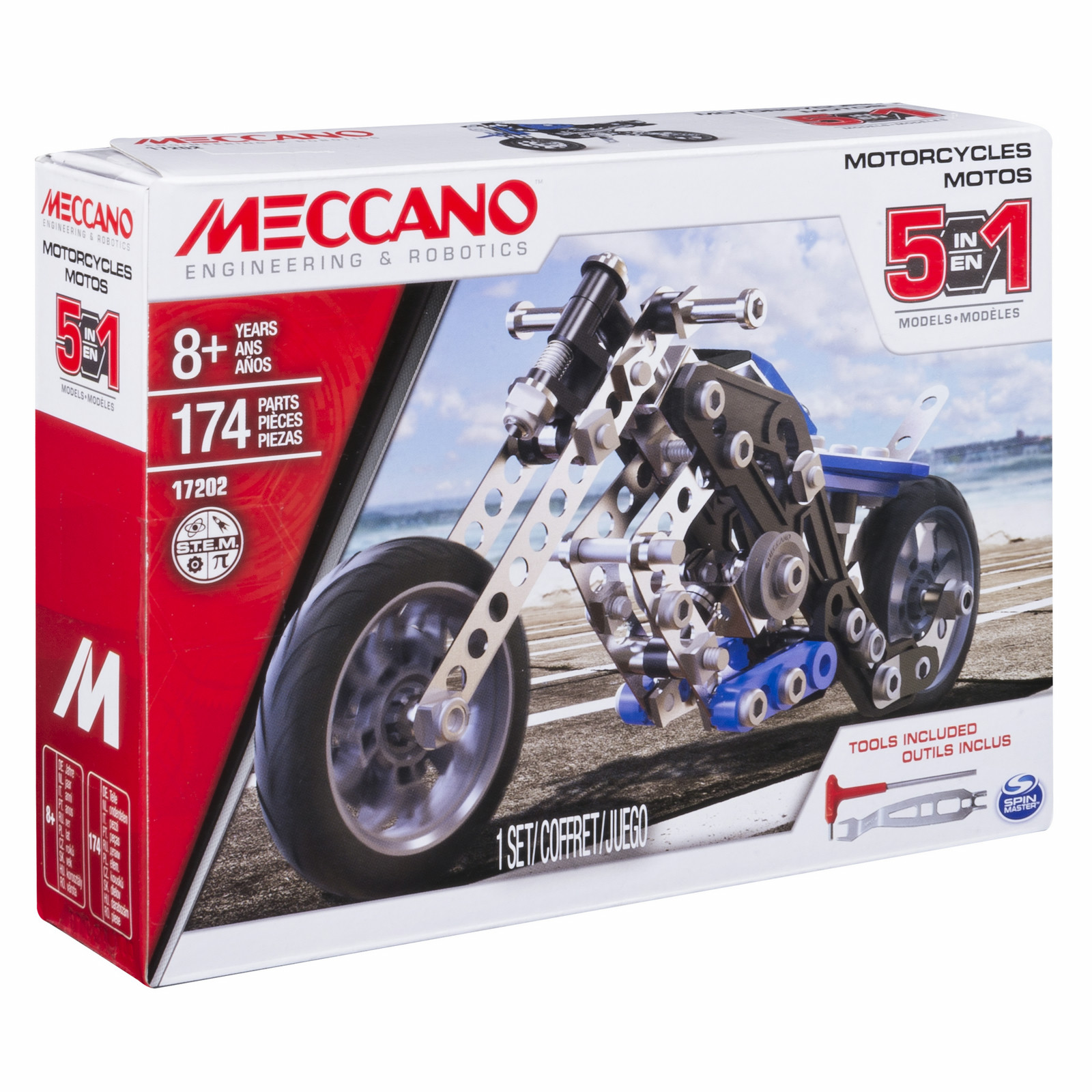 Multi 5 Model Set Motorcycle, Meccano. Typ: Vehicle erector set, Mindestalter: 8 Jahr(e), Anzahl Teile: 174 Stück(e). Gewicht: 340 g, Verpackungsbreite: 200 mm, Verpackungstiefe: 50,8 mm. Verpackungsart: Box. Menge pro ISO Container (20 Fuß): 14015 Stück(e), Menge pro ISO Container (40 Fuß): 28030 Stück(e), Menge je Palette: 1000 Stück(e)