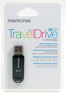 Memorex TravelDrive 32GB. USB-Version: USB 2.0, USB-Anschluss: Typ A, Unterstützte Windows-Betriebssysteme: Windows 2000, Windows 2000 Professional, Windows 7 Home Premium, Windows 7 Professional, Windows 7 S. Formfaktor: Kappe, Produktfarbe: Schwarz
