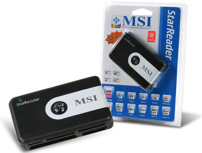 MSI StarReader, 52 in 1 Card Reader. Gebündelte Software: SIM Editor. Abmessungen (BxTxH): 87,5 x 53 x 16 mm, Kompatible Betriebssysteme: Windows XP(SP2)/2000(SP4)/VISTA/ME/98SE