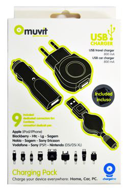 Muvit MUCHP0034. Aufladetyp: Auto, Innenraum, Aufladekompatibilität: Digitalkamera, Handy, MP3, Tragbare Spielekonsole, Energiequelle: AC, Zigarettenanzünder. Produktfarbe: Schwarz