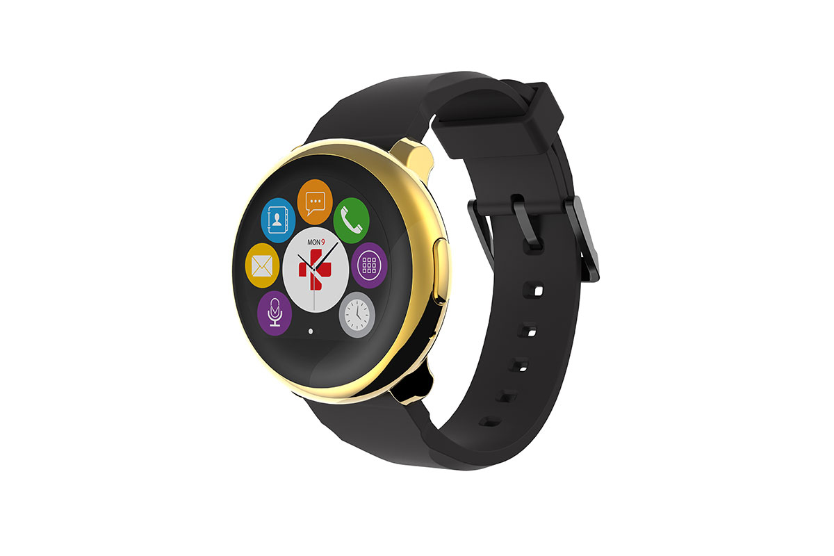 MyKronoz ZeRound. Gehäusefarbe: Gold, Gelb, Armbandfarbe: Schwarz, Form: Rund. Batterietechnologie: Lithium-Ion (Li-Ion), Batteriekapazität: 300 mAh, Batterielebensdauer: 72 h. Breite: 45 mm, Tiefe: 45 mm, Dicke: 1,32 cm. Mitgelieferte Kabel: USB. Verpackungsbreite: 12,8 mm, Verpackungstiefe: 6,5 mm, Verpackungshöhe: 9,8 mm