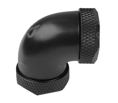 Hierbei handelt es sich um einen 90° gewinkelten Schraubanschluss in Schwarz mit zweifachem Adapter zur Verbindung von zwei CoolForce PETG-Röhren mit einem äußeren Durchmesser von 16 mm (oder Acryl-Röhren mit identischer Dimensionierung) in Wasserkühlungssystemen. Der Adapter ist eine Kopplung zur Verbindung zweier CoolForce PETG-Röhren (oder Acryl-Röhren mit identischer Dimensionierung), die nicht auf einer gemeinsamen Geraden verlaufen. Für Abdichtung sorgen dabei zwei Gummiringe auf jeder Seite. Zusätzlich werden die CoolForce PETG-Röhren (oder Acryl-Röhren mit identischer Dimensionierung) jeweils mit Schraubverschlüssen gesichert.