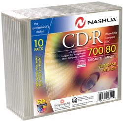 Nashua CD-R 80min-700Mb 52x (10). Kapazität ohne Komprimierung: 700 MB, Menge pro Packung: 10 Stück(e), Schreibgeschwindigkeit CD: 52x. Abmessungen (BxTxH): 140 x 120 x 4 mm