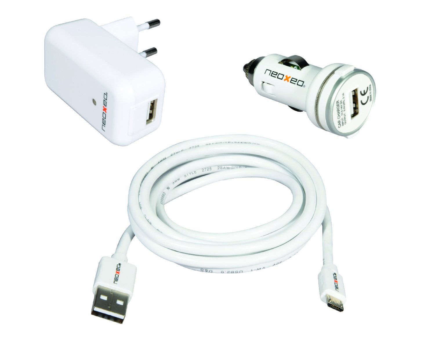 Neoxeo X250A25019. Aufladetyp: Auto, Aufladekompatibilität: Smartphone, Tablet, Energiequelle: Zigarettenanzünder. Produktfarbe: Weiß, Kabellänge: 1,5 m. AC-Adapter Outputstrom: 2,1 A. Mitgelieferte Kabel: AC, USB, Verpackungsart: Blister
