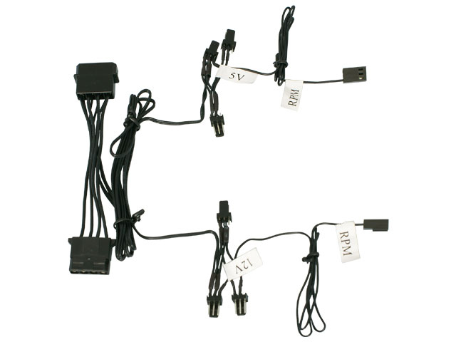 NesteQ 12V/5V Lüfter Stromkabel verbinden 3 Lüfter mit 3-Pin Anschluss bei 12V und 3 Lüfter mit 3-Pin Anschluss bei 5V. Das Kabel wird mit einem 4-Pin Molex Anschluss des Netzteiles verbunden. Speziell Lüfter die mit 5V betrieben werden, können effektiv in der Geräuschentwicklung reduziert werden.