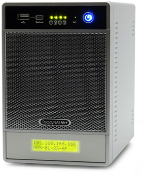 Netgear ReadyNAS NV+ . Internes RAM: 0,25 GB, Flash-Speicher: 64 MB. Stromverbrauch (typisch): 55 W. Gewicht: 4,6 kg. Gebündelte Software: EMC Retrospect Professional (Windows) EMC Retrospect Desktop (Macintosh). Zertifizierung: FCC, UL, CE, C-tick, RoHS