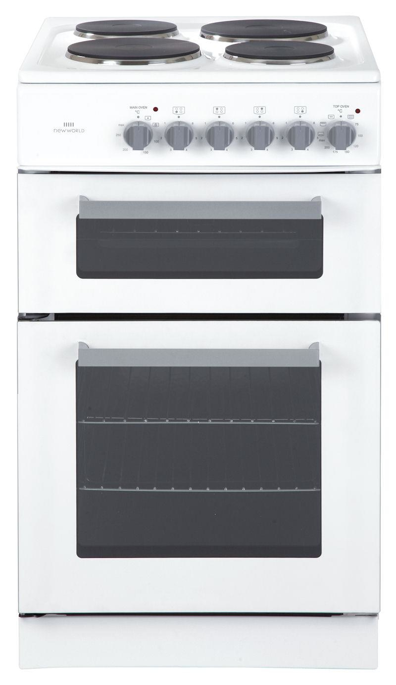 New World EDF50. Produkttyp: Freistehend, Produktfarbe: Weiß, Kontrolltyp: Rotation. Kochfeldtyp: Sealed plate hob, Brenner/Kochzone 1 Typ: Klein, Brenner/Kochzone 2 Typ: Medium. Stromquelle Ofen: Elektro, Bruttorauminhalt Ofen: 22 l, Ofenleistung: 1200 W. Energie-Effizienzklasse: A, AC Eingangsspannung: 220 - 240 V, AC Eingangsfrequenz: 50 Hz. Breite: 500 mm, Tiefe: 600 mm, Höhe: 900 mm