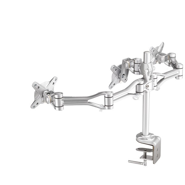 Die NewStar Tischhalterung, das Modell FPMA-D1030D-3, ist ein Neig-, Schwenk- und drehbare Tischhalterung für drei Flachbildschirme bis 18" (46 cm). Diese Halterung ist eine gute Wahl für platzsparende Platzierung auf Schreibtischen mit einer Tischklemme.