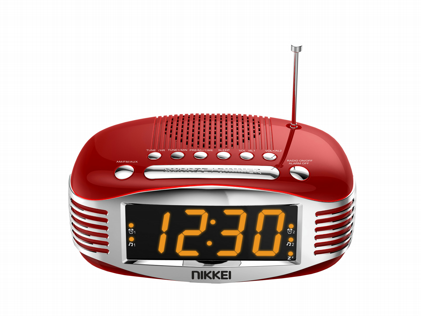Nikkei NR400. Radiotyp: Uhr, Tunertyp: Digital, Unterstützte Bänder: AM, FM. Breite: 179 mm, Tiefe: 116 mm, Höhe: 84 mm. Stromverbrauch (typisch): 3 W. Paketgewicht: 599 g. Verpackungsbreite: 23 cm, Verpackungstiefe: 13,5 cm, Verpackungshöhe: 9 cm