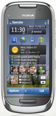 Nokia C7-00. Bildschirmdiagonale: 8,89 cm (3.5 Zoll), Bildschirmauflösung: 640 x 360 Pixel, Anzahl der Farben des Displays: 16,78 Millionen Farben. Max. Speicherkartengröße: 32 GB, RAM-Speicher: 8000 MB. Digitaler Zoom: 2x, Flash-Typ: LED. Sim Card Steckplätze: Single SIM, 2G-Standards: EDGE,GPRS, 3G-Standards: HSDPA,HSUPA. USB-Stecker: Micro-USB A, Kopfhörer-Konnektivität: 3,5 mm