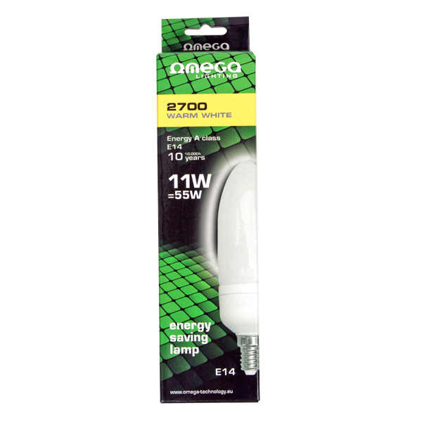 Omega 11W 2700K E14. Lampenleistung: 11 W, Equivalente Glühlampenleistung: 50 W, Glühbirnengröße: Glühbirne. Eingangsspannung: 220-240, Eingangsfrequenz: 50/60. Gewicht: 50 g