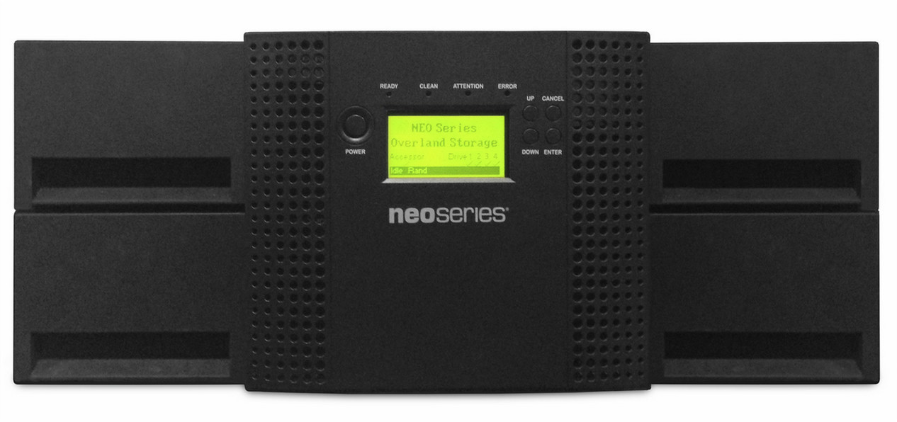 Overland Storage NEOs T48. Standard-Schnittstellen: Fiberkanal, Magnetband-Typen unterstützt: LTO-6. Formfaktor: 4U, Produktfarbe: Schwarz. Energiebedarf: 100-240 VAC, 50/60 Hz. Abmessungen (BxTxH): 175,3 x 447 x 739,9 mm