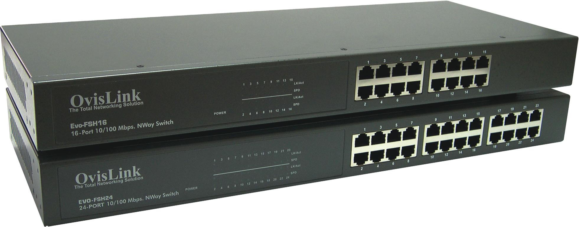 OvisLink Evo-FSH24. Switch-Typ: Unmanaged network switch. Max. Datenübertragungsrate: 4,8 Gbit/s. Produktfarbe: Schwarz, Zertifizierung: UL, CUL, TUV, CE. Eingangsspannung: 90 - 240. Gewicht: 3,5 kg