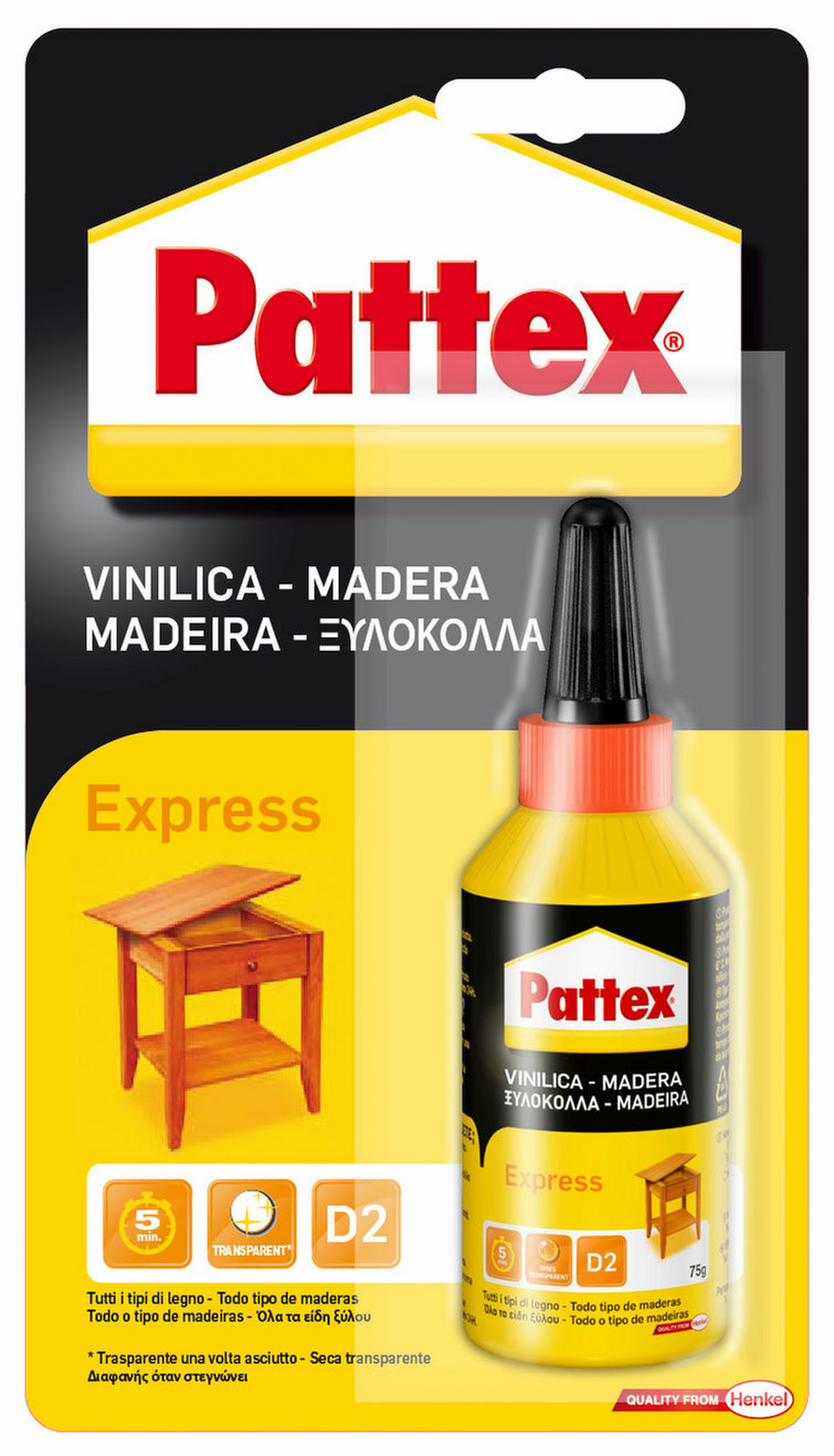 Pattex Vinilica Express 75g. Werkstoff: Gel, Klebetyp: Polyvinylacetat (PVA) Klebemasse, Kapazität: 75 g. Verpackungsart: Sichtverpackung. Menge pro Packung: 1 Stück(e)