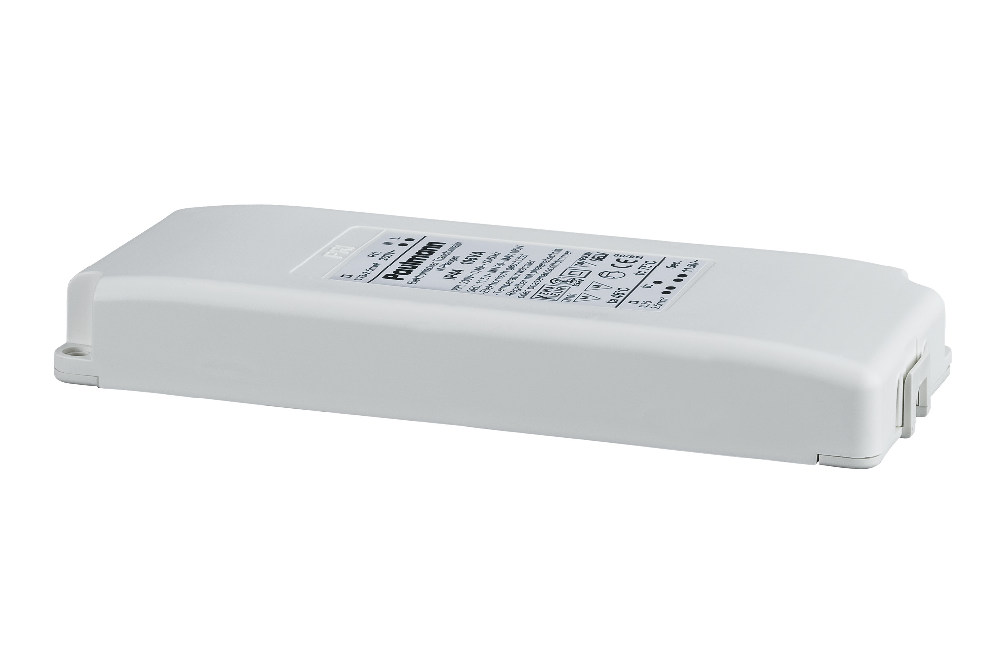 Paulmann VDE IP44 105W. Ausgangsspannung: 12 V, Schutzart: II. Länge: 14,4 cm, Breite: 56 mm, Höhe: 20 mm. Produktfarbe: Weiß. Zertifizierung: VDE