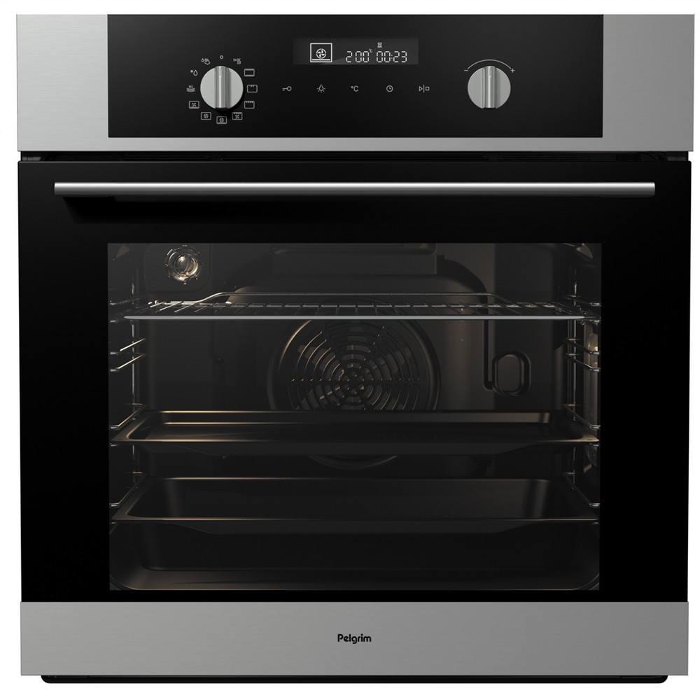 Pelgrim OVM516RVS. Ofentyp: Electric oven, Gesamtes Fassungsvermögen Garraum Ofen: 67 l, Innenkapazität des 1. Backofens: 67 l. Produktfarbe: Schwarz, Edelstahl, Kontrolltyp: Rotation, Sensor, Kontrollposition: Vorderseite. Energie-Effizienzklasse: A. Breite: 597 mm, Tiefe: 568 mm, Höhe: 596 mm