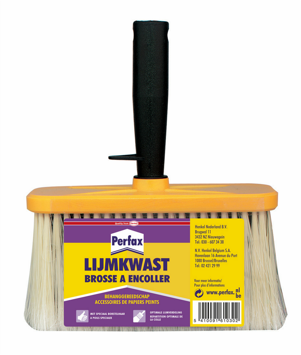 Perfax 5410091610302. Produkttyp: Tapetenkleisterbürste, Produktfarbe: Schwarz, Weiß, Gelb, Handgrifffarbe: Schwarz. Gewicht: 245 g. Verpackungsbreite: 172 mm, Verpackungstiefe: 77 mm, Verpackungshöhe: 222 mm