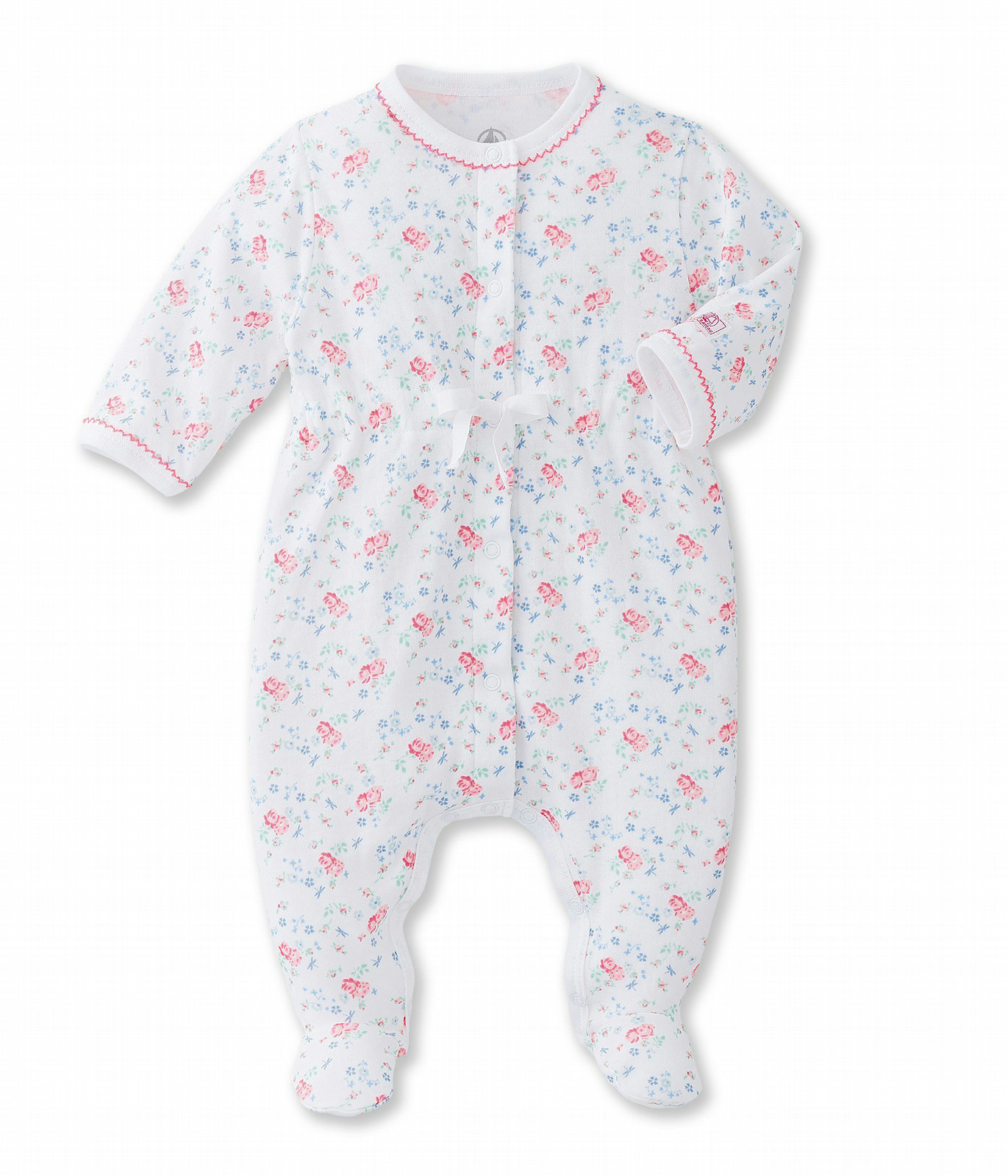 Dieser Baby Mädchen Spieler aus weichem Strickgarn ist ganz bedruckt mit Blümchen. Die leuchtfarbene Picotkanten und die schmalen geflochtenen Bändchen an den Ärmeln sind einfach wunderbare Details. Ein Baby Schlafanzug, der zur Erstausstattung eines Neugeborenen gehört!
