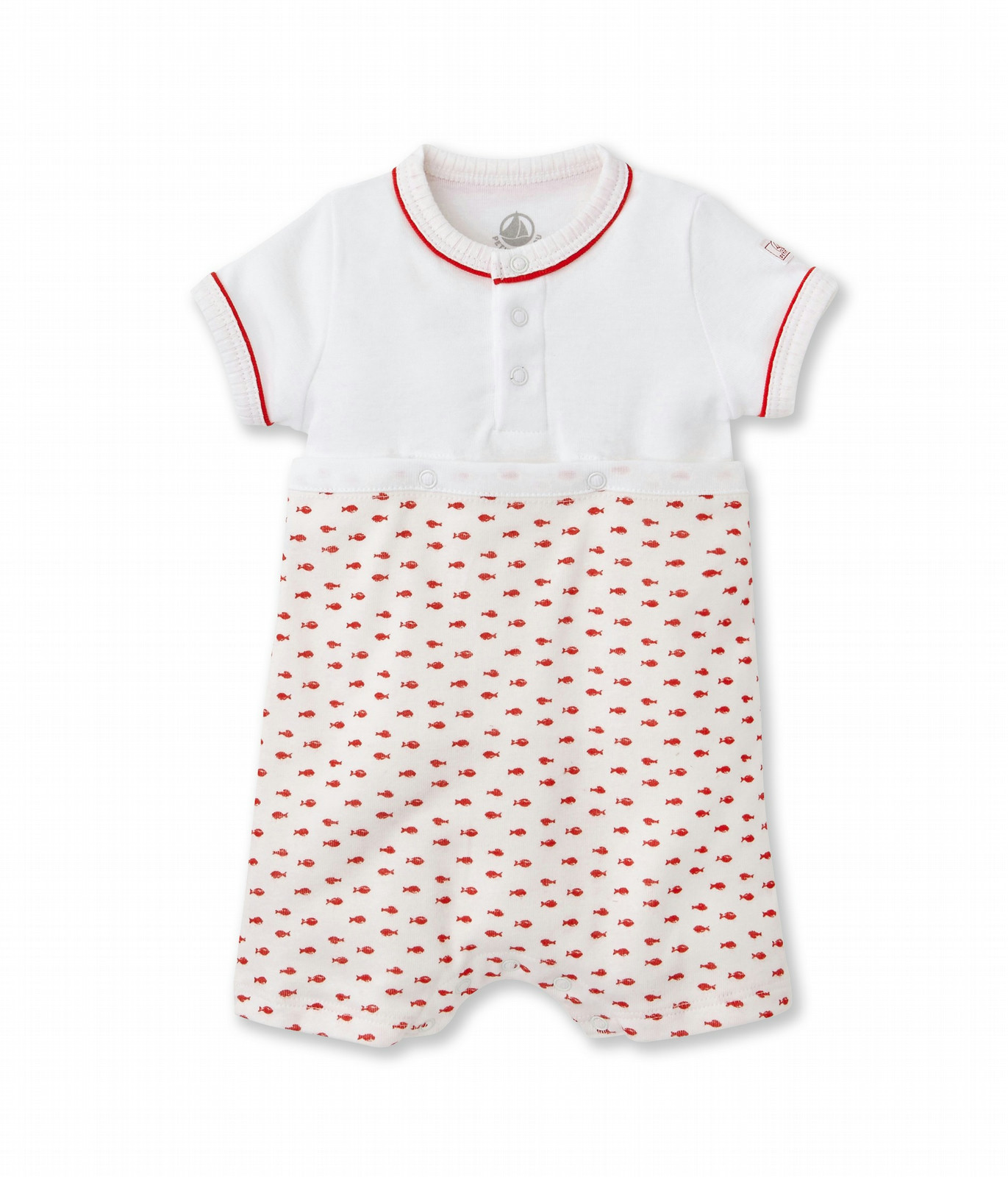Dieser kurze Baby Jungen Overall, aus reinem 1x1 Rippenbaumwollstoff ist designed als zwei in einem Anziehsache. Das Baby Kleidungsstück besteht aus einem einfarbigen T-Shirt, das sich mit Druckknöpfen an die bedruckte Shorts anknöpfen läßt. Besonders beliebt ist die niedliche Zierleiste und die praktische Öffnung mit Druckknöpfen zwischen den Beinen, die das An- und Umziehen erleichtert. Material: 100% Baumwolle