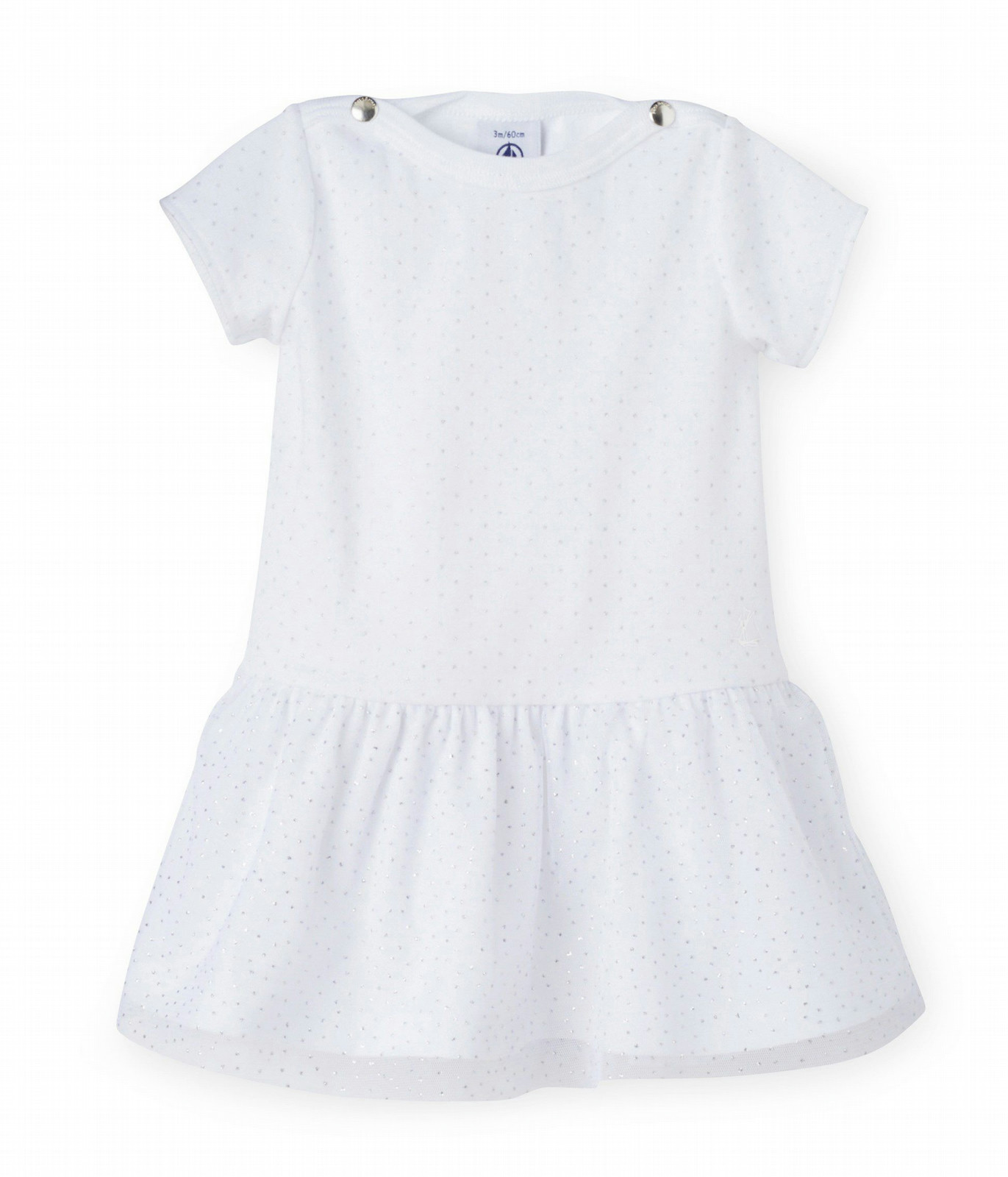 Dieses Baby Mädchen Kleid mit den kurzen Ärmeln ist aus reinem 1x1 Rippenbaumwollstoff und mit Glitter besetztem Tüll, hergestellt. Das Oberteil ist mit einem silbernen Pünktchenmuster und einem Admiralskragen und den zwei Druckknöpfen reizend verziert. Der Tüllrock ist gefüttert mit einem 1x1 Rippenbaumwollstoff für einen angenehmen Tragekomfort. Ein richtig kleines Partykleid! Material: 100% Baumwolle