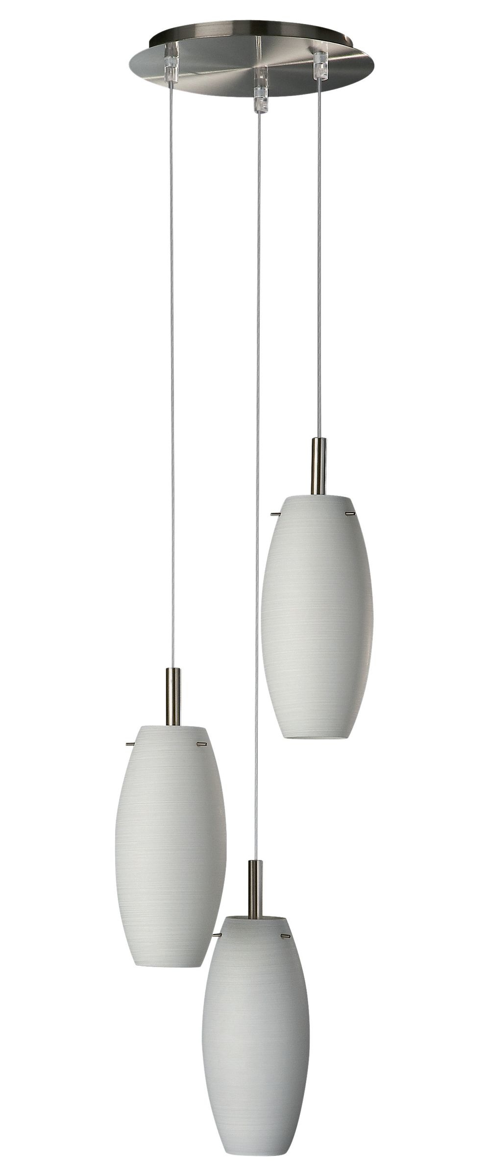 Three-light pendant in Matte Chrome finish with patterned white glass.