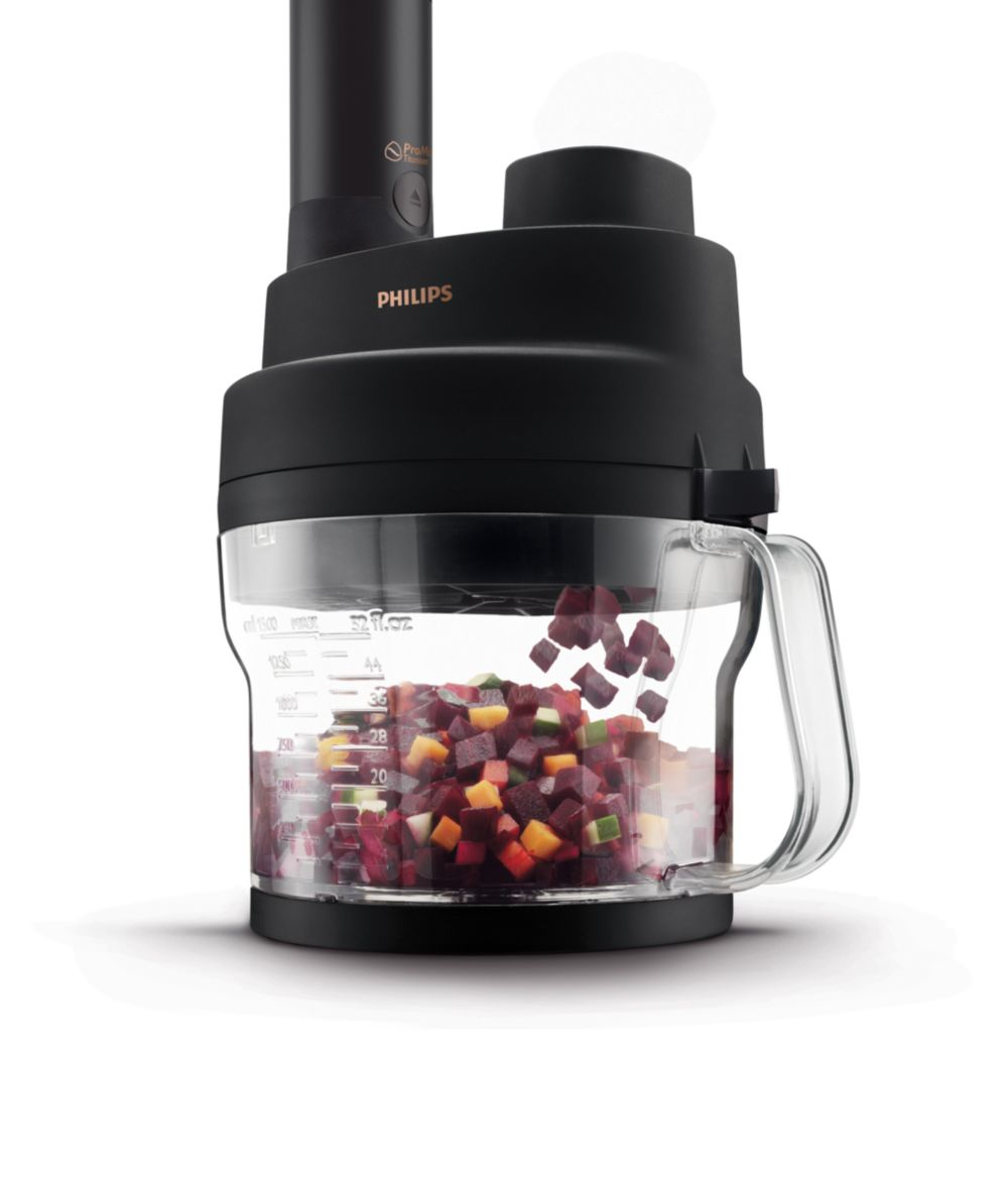 The food processor accessory extends the functionality of your Philips SpeedTouch hand blender. Use the cubecutter to make perfect cubes and the slicing and grating disk to easily process vegetables. It can even cut raw vegetables!