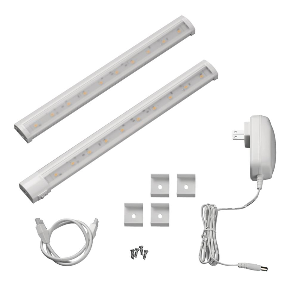 High brightness white LED under cabinet light. Kit includes two 12" strips, one 12" long jumper cable, plug-in power converter, and mounting hardware.