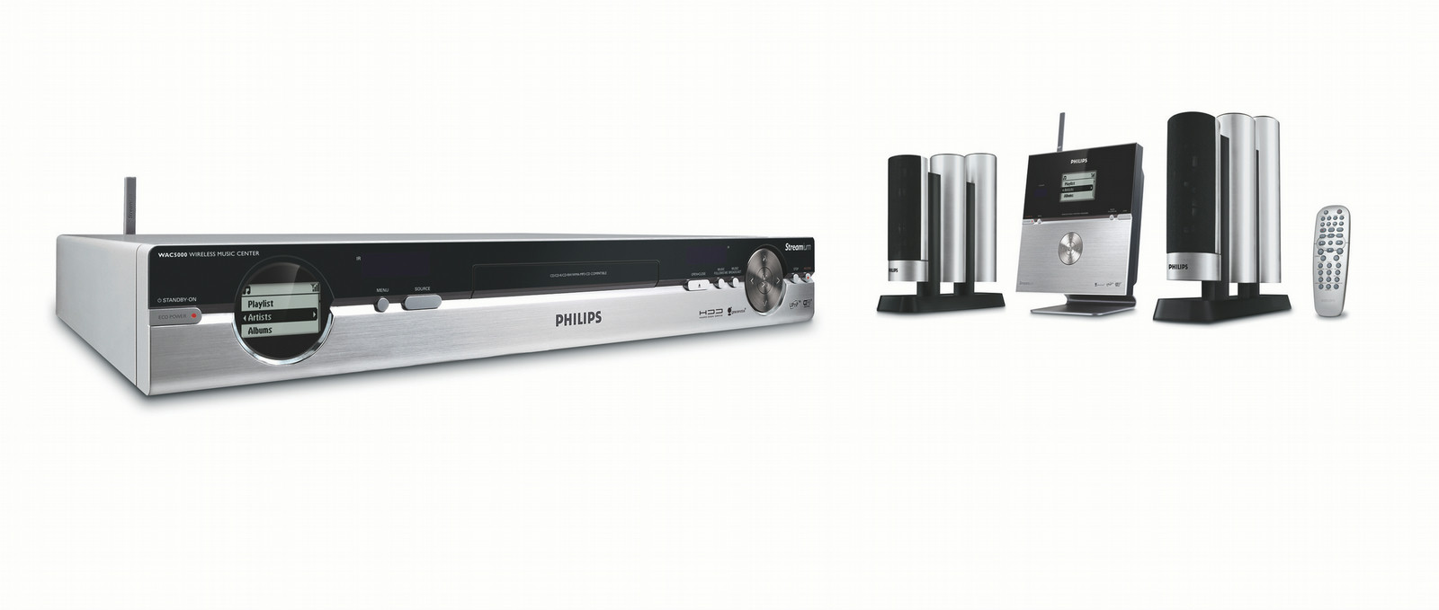 Upgrade your Hi-Fi to Wi-Fi with WACS5000-a component style Wireless Music Center with 80GB hard disk to store 1500 CDs. Plus, its Wireless Station with Patented Pipe Speakers lets you enjoy your music collection in superb sound quality.