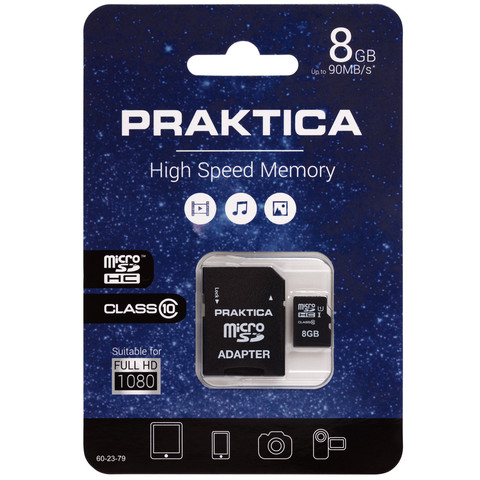 Praktica 8GB, Class 10, Micro-SDHC. Kapazität: 8 GB, Flash Card Typ: MicroSDHC, Flash-Memory-Klasse: Class 10. Produktfarbe: Schwarz. Speicherspannung: 2.1,2.7,2.8,3.3,3.6 V. Breite: 12 mm, Tiefe: 1 mm, Höhe: 11 mm. Speicheradapter enthalten: SD, Verpackungsart: Blister