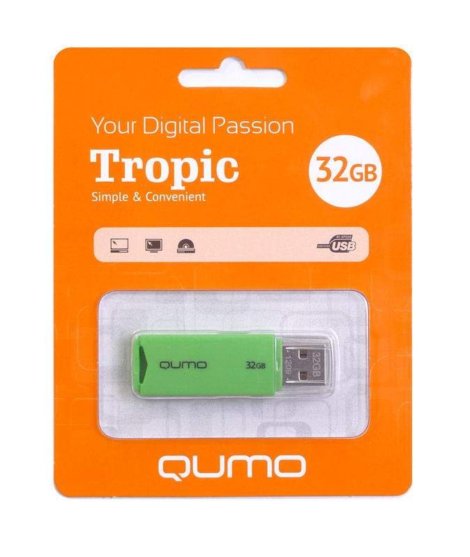 QUMO 32GB Tropic. Kapazität: 32 GB, USB-Version: USB 2.0, USB-Anschluss: Type-A. Formfaktor: Kappe, Produktfarbe: Grün. Breite: 56 mm, Tiefe: 15 mm, Höhe: 17 mm. Verpackungsart: Blister