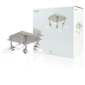 Ranex RA-INDOOR06. Produktfarbe: Gebürsteter Stahl, Vorgesehene Verwendung: Innenraum, Produkttyp: Surfaced lighting spot. Fassungs-/Sockeltyp: G9, Wattage der im Lieferumfang enthaltenen Lampe: 40 W, Leuchtmitteltyp: Halogen. Energiequelle: AC. Höhe: 155 mm, Länge: 27 cm, Breite: 270 mm. Verpackungshöhe: 153 mm, Verpackungslänge: 26,3 cm, Verpackungsbreite: 265 mm