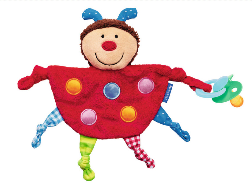 Wo ist der Schnuller? Keine Sorge: Dieses Schmusetuch mit seiner praktischen Klettschlaufe hält ihn immer in Reichweite. Der flauschige Käfer ist herrlich leicht und weich, auch zum Kuscheln und Liebhaben. Fünf große, bunte Stoffknoten laden zusätzlich zum Nuckeln und Greifen ein.