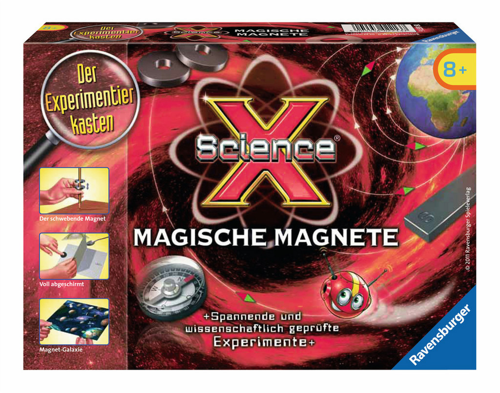 Stabmagnet, 2 Ringmagnete, Faden, Kompass, Unterlegscheibe, Fizz, Galaxienkarte, ausführliches Anleitungsheft