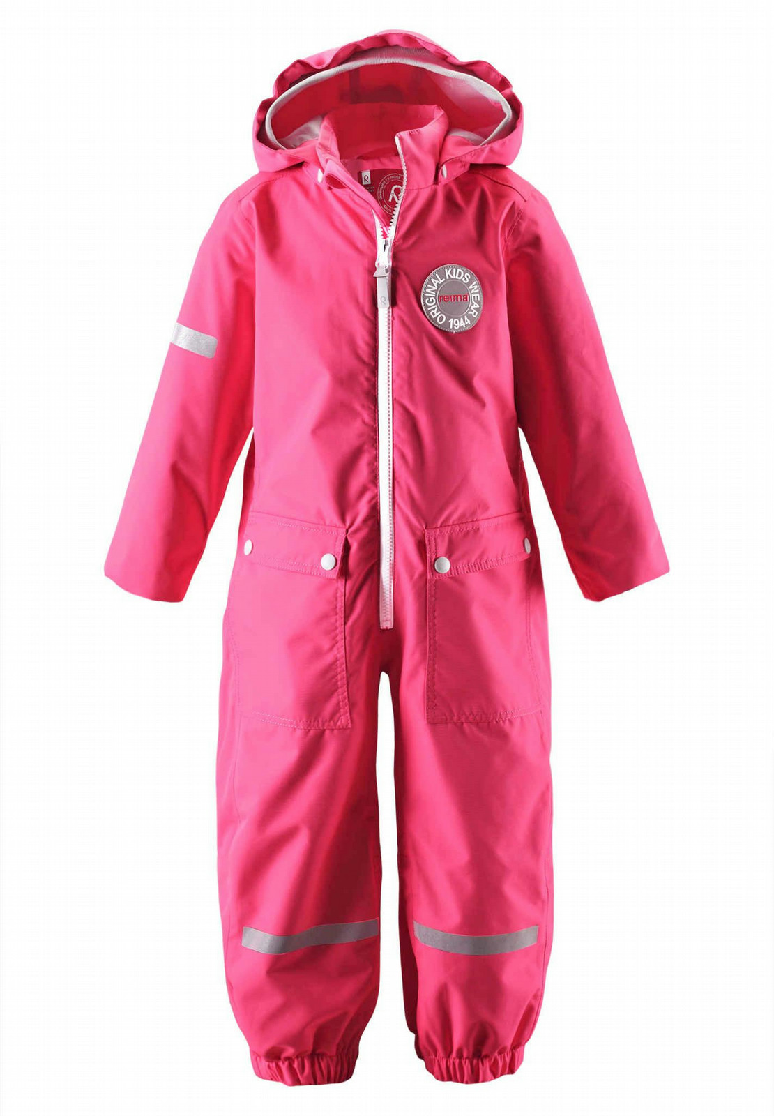 Funktioneller Outdoor Overall für aktive Kinder im Retrostyle der 70 Jaher Reima ® Geburtstagskollektion. Sollte es noch kühler sein, kann man diesen Overall mit einem Bekleidungsteil aus der Reima ®Layer Kollektion mit einigen wenigen Handgriffen verbinden. Die Taille läßt sich mit einem elastischen Gummizug in der Weite regulieren, die Kapuze ist abnehmbar und die robusten Silikon Fußschlaufen machen jede Bewegung mit.