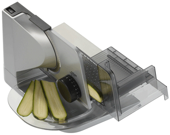 Die Vollmetallausführung des Geräts bietet ein hohes Maß an Stabilität und Schneidleistung. Durch die Schrägstellung lässt sich großes und weiches Schneidgut, wie beispielsweise gekochter Schinken, besonders leicht und gut schneiden.
