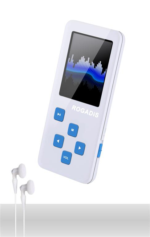 Rogadis M-212. Typ: MP4. Produktfarbe: Weiß. Spieler Medientyp: Flash-media, Gesamtspeicherkapazität: 4 GB, Kompatible Speicherkarten: microSD (TransFlash). Anzeige: TFT, Bildschirmdiagonale: 4,57 cm (1.8 Zoll). Unterstützte Audioformate: MP3, WAV, WMA, Unterstützte Bildformate: BMP, GIF, JPG, PNG